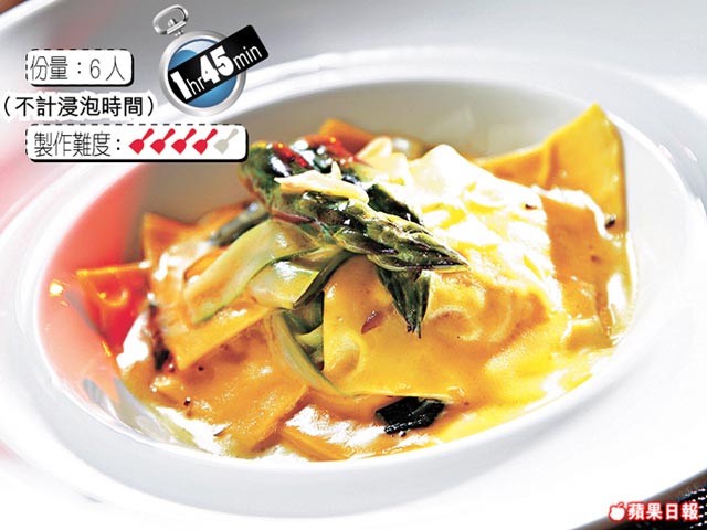 麪粉 1公斤、意大利雞蛋 500克、 28個月風乾火腿 600克、意大利香草麪包 150克、牛奶 500毫升、蘆笋(刨片) 25條、牛油 40克、水適量、鼠尾草 2條、蛋液(掃皮用)適量