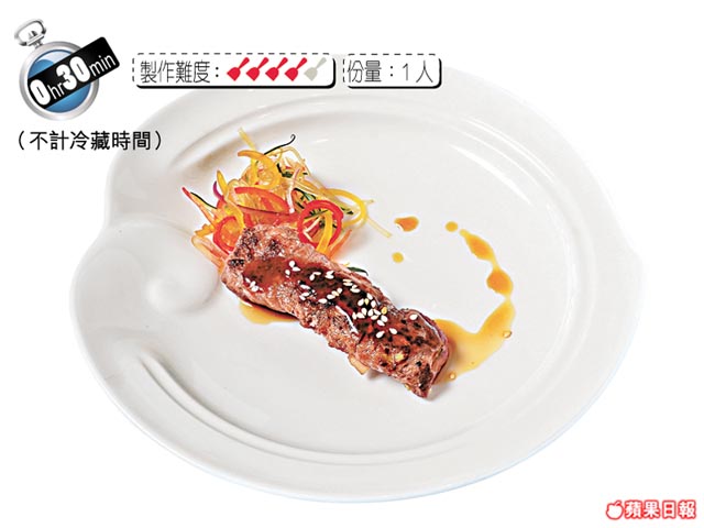 將肉眼位置切薄,以簡單葱花調味,最能吃到牛肉味的香濃。 材料 牛肉眼40克、洋葱粒/葱白粒各10克、牛脂肪/海鹽/燒汁/芝麻各少許 做法 1.將牛肉眼片成4吋×4吋、約1分厚的薄片,放冰格雪硬。 2.燒熱鑊,下牛脂肪、海鹽,爆香葱白粒、洋葱粒,盛起。 3.燒熱原鑊,爆香牛脂肪、下海鹽後熄火,放牛肉薄片,上放(2),開大火,包好後上碟,撒上芝麻,淋上燒汁,完成。 貼士: 包牛肉時動作要快,牛肉煮至八成熟即可,否則過熟,肉質粗。 資料來源︰蘋果日報2012年5月19日 0 0 0 書籤 留言 (0) 登入即可留言 poon.hp 2025年01月17日 11:53 好 0 舉報