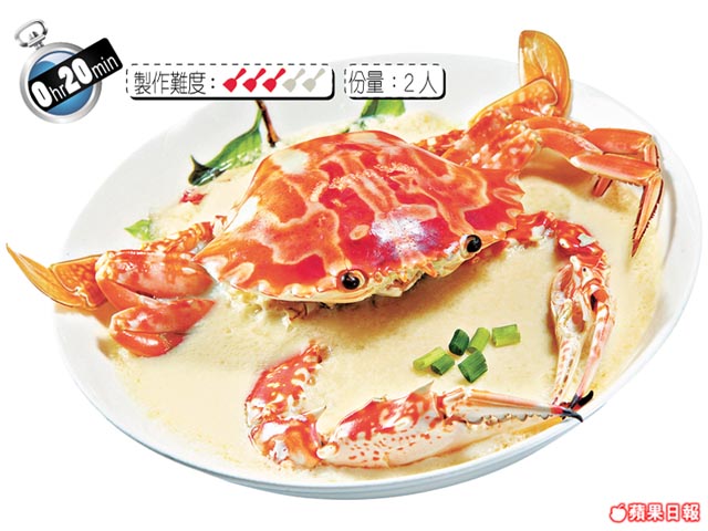 材料 花蟹1隻、蛋白4隻、清水200毫升、花雕酒6湯匙、鹽少許 做法 1.蟹洗淨後以大火隔水蒸5分鐘,盛起,備用。 2.蛋白加入花雕酒、清水、鹽拂勻,倒入(1),再以慢火隔水蒸5分鐘,取出,完成。 資料來源︰蘋果日報2012年05月12日 0 0 0 書籤 留言 (0) 登入即可留言