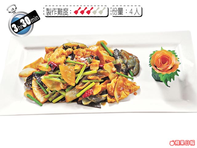 3. 另再燒熱鑊,將肉片、海參、冬笋、洋葱、木耳和蒜芯加入鑊中,爆炒出香味,加鹽、雞粉、蠔油和生抽繼續以中大火爆炒,下生粉水煮至收汁,最後淋上陳醋即可。