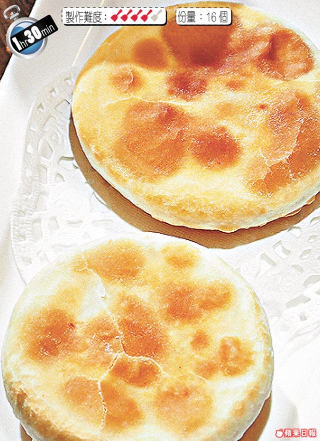 1.高筋麪粉、低筋麪粉拌勻,加豬油拌勻,撞入暖水搓成麪糰,分成每份約20克的小麪糰,略壓扁,用麪棍碾成薄圓形。