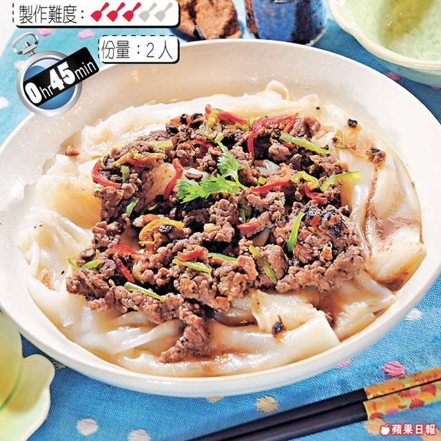 陳村粉400克、肥牛150克、青椒絲/紅椒絲各少許、陳皮豆豉醬1.5湯匙