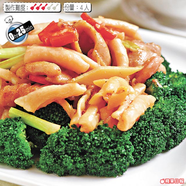 4.起油鑊爆香薑、葱段、金銀蒜,加雞肉片、桂花蚌及調味料炒勻,放在西蘭花面即可。