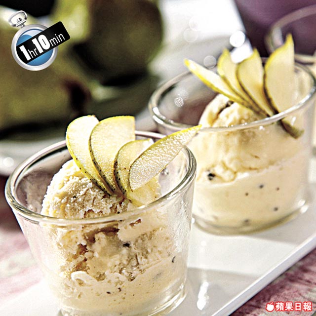 3.倒入電動雪糕機,加入可可碎攪約45分鐘至凝固成雪糕,盛起後放入切片啤梨作裝飾即可。