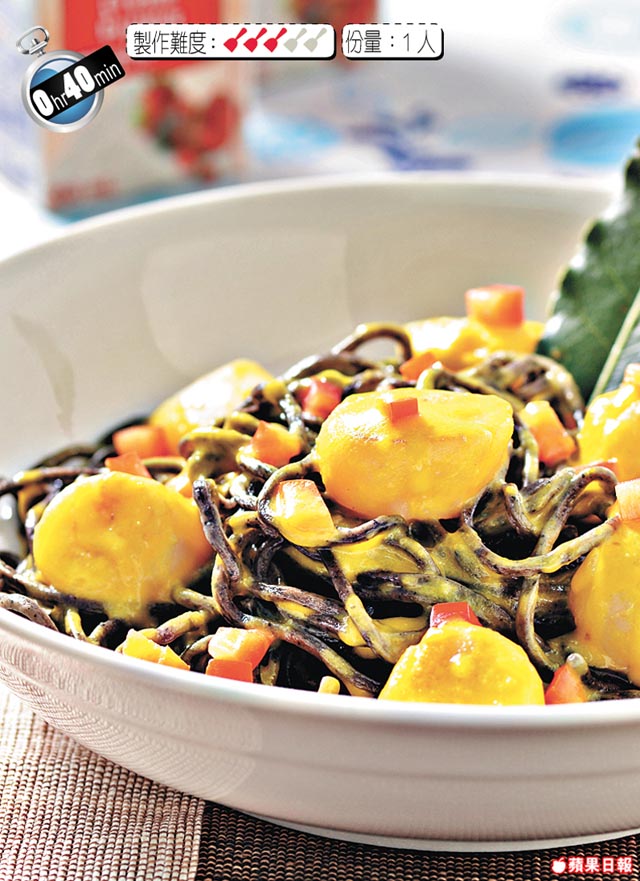 黑芝麻蘆薈麪/洋葱絲各1個、甘笋粒/西芹粒各50克、黑椒碎1茶匙、月桂葉1片、南瓜片/淡忌廉各100克、白酒4湯匙、雞湯250毫升、滾水800毫升、帶子8隻、黑胡椒粒/紅椒粒各10克、鹽少許