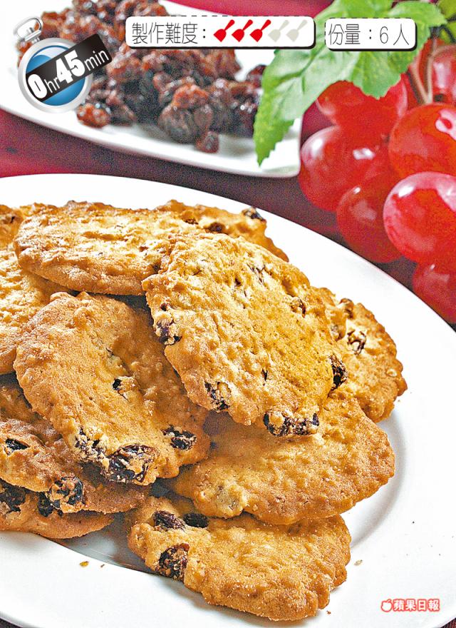 無鹽牛油275克、糖粉200克、燕麥/巨峰提子乾各150克、奶粉20克、蛋4隻、低筋麪粉400克、泡打粉2 1/2克