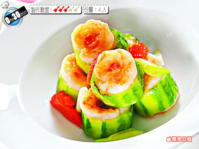 5.起油鑊,爆香甘笋片、薑片、葱段、蒜茸,加雞湯、絲瓜環,煮至蝦熟透,最後以鹽、糖、生粉、水埋芡略炒,拔走竹籤上碟即可。