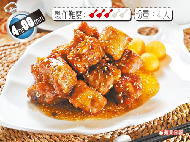 做燒骨用的腩排,可選一字排,骨肉較均勻,炸過後勁香口。 材料 豬腩排500克、哈密瓜(挖球)適量 醃料:鹽/糖各1/2茶匙、香茅粉/柱侯醬/生抽/麪粉/生粉各1茶匙 蜜梅汁:冰梅醬120克、芝麻/白醋各1/2湯匙、蜜糖1湯匙、生抽1茶匙 做法 1.豬腩排洗淨加入醃料拌勻,醃最少3小時。 2.燒熱油至180℃,放入豬腩排,收細火炸約4分鐘,轉大火炸約半分鐘至表面金黃,撈起。 3.另起鑊,下蜜梅汁料煮滾,將豬腩排回鑊,快手兜勻上碟,以哈密瓜球伴碟即成。 貼士: 以生粉及麪粉混合,炸出來的腩排脆身得來不會過硬。 資料來源︰蘋果日報2012年09月11日 0 0 0 書籤 留言 (0) 登入即可留言 wah2021 2025年09月30日 10:35 thx 0 舉報 poon.hp 2025年02月09日 11:30 好 1 舉報