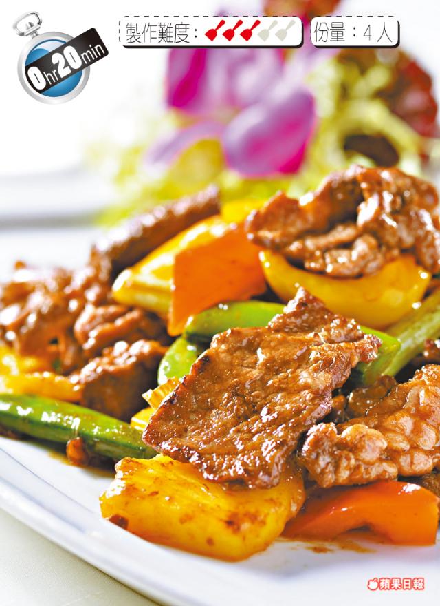 黃牛仔肉(切片)5両、菠蘿(切塊)3両、蜜豆/紅甜椒/黃甜椒(切塊)各2両、薑粒/葱段/生抽各1茶匙、老抽半茶匙、鹽少許、生粉芡水2茶匙