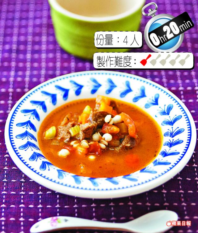 番茄抗氧化、薏米去水腫,而牛肉抗寒暖胃,都是秋季的極佳食材,加上大量蔬菜纖維,十分健康有益。