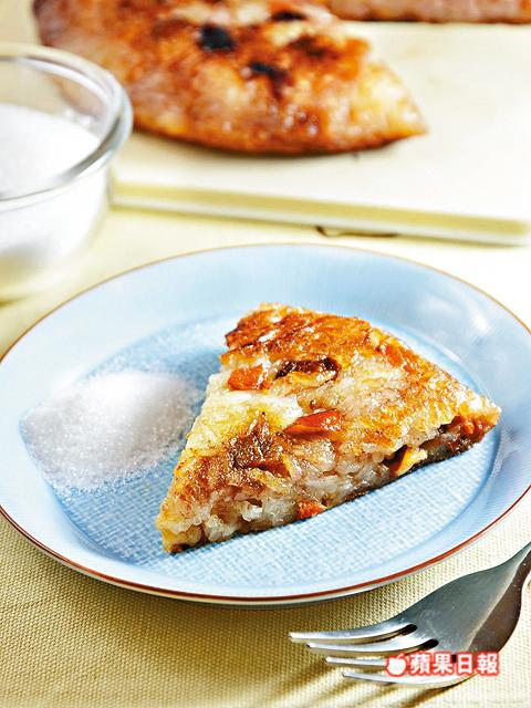 5.待糯米略凍後,把整件糯米飯取離碟。平底鑊燒2湯匙油,輕輕放下糯米飯煎至兩面金黃香脆。