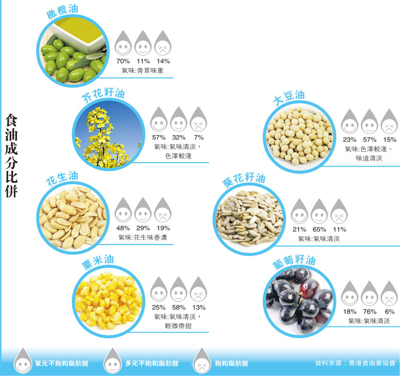 超市內食油品眾多,支支自稱是健康之選。詹兆洲說,從營養角度分析,是否「好油」應看其脂肪酸的比例,「理想的選擇,應是單元不飽和脂肪酸比例愈多愈好,而飽和脂肪酸的比例則愈少愈好」。他解釋,單元不飽和脂肪酸能降低血液中的壞膽固醇(LDL)、提升好膽固醇(HDL),相反飽和脂肪酸會增加血液中的壞膽固醇,影響心臟健康。