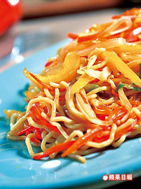 3.加入紅蘿蔔絲、椰菜絲、洋葱絲及黃椒絲同炒,其間加水少許。