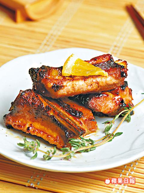 聽營養師說過,有骨的肉一般較多脂肪,Max想出以普洱茶先將肉汆水,然後以橙皮果醬、茶葉及各種調味將豬肋排醃製,如此就能去除油膩感,烤煮也較安全。不過甜度高的醬汁很易燒焦,所以火候控制很重要,若用炭火燒烤很易過熱,宜待爐火略收才進行。
