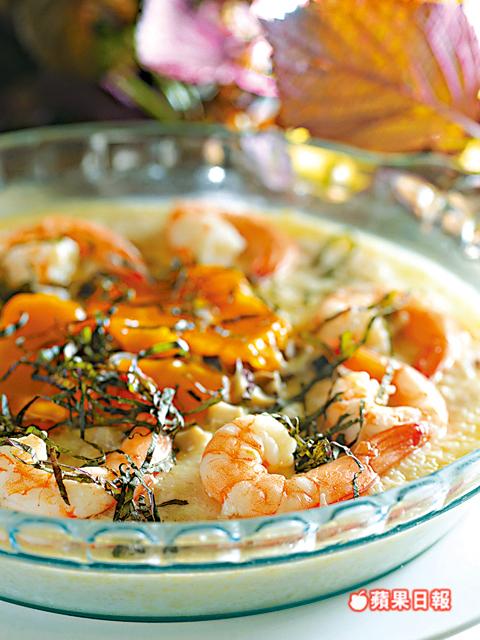 3.取出後再放上鹹蛋和鮮蝦蒸約3分鐘。