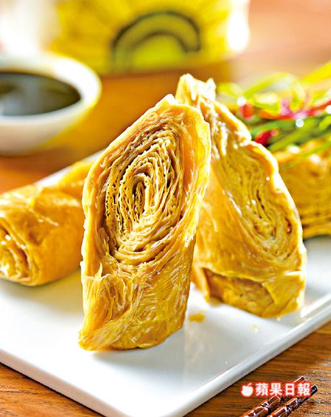 腐皮本身有濃郁的黃豆香,如果想讓豆香加倍,最直接不過的做法就是塗上豉味濃郁的生抽皇醬油來炮製腐皮卷,軟軟腐皮會吸收醬油香。