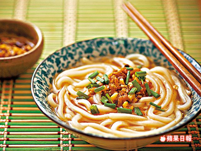8.盛起麵,於上面淋上木魚汁,加上1湯匙藥膳辣油,並以葱粒點綴即成。