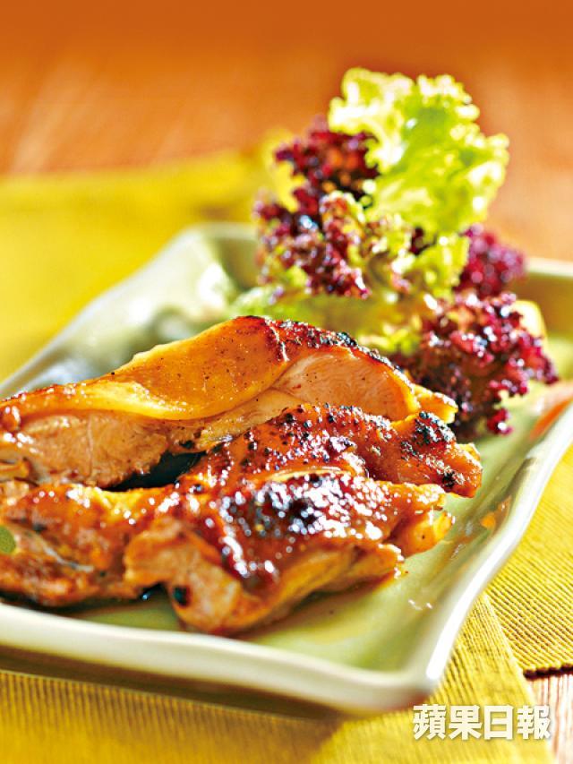 3.焗爐預熱至190℃。把雞件上的醃料掃走,下油鍋中煎香兩面至金黃,放入焗爐焗約15分鐘。取出,掃上蜜糖再焗數分鐘至金黃即可。