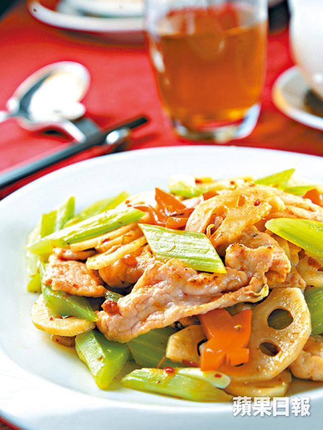 3.燒熱油鑊,放入藕片、甘笋花、西芹、葱爆香,加入已拌勻的調味汁,把肉片回鑊炒勻即成。