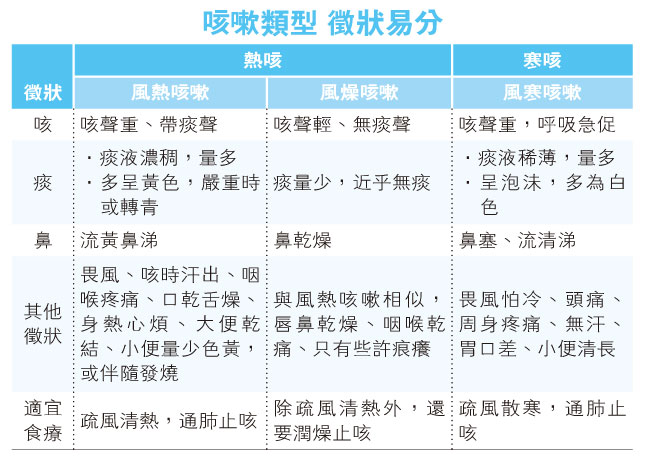 風熱和風燥咳嗽均屬熱咳,進食性質寒涼、疏風清熱的食材,的確有助緩解咳嗽,尤其是風熱咳嗽;不過,若屬風寒咳嗽,再進食寒涼食材,寒上加寒,便會加重咳嗽,故用藥前必須先分清咳嗽類型。