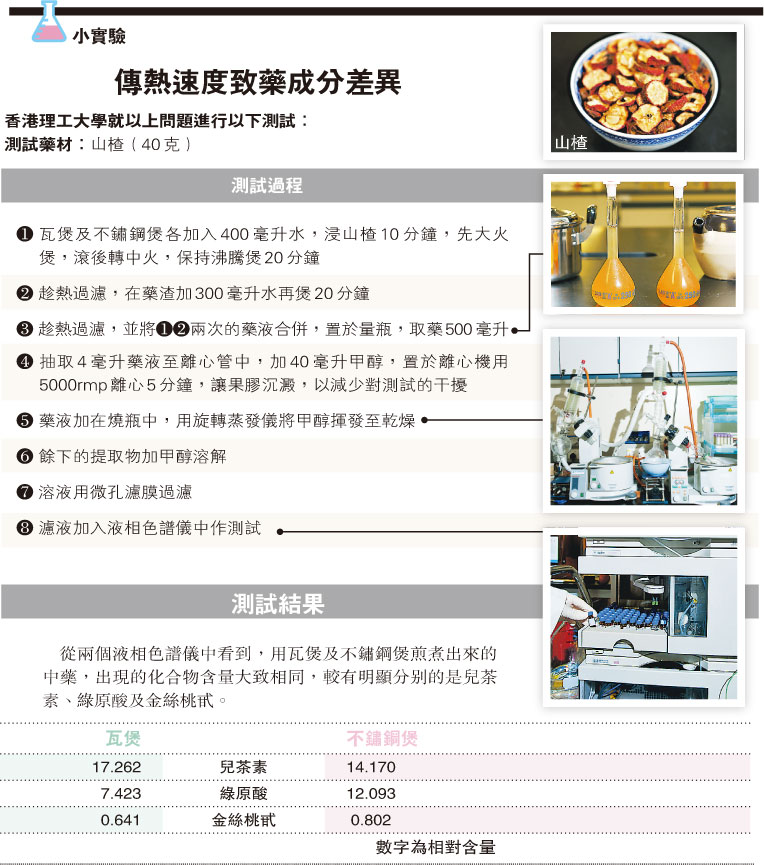 莫錦華博士估計,「不鏽鋼煲傳熱比瓦煲快,煎煮過程或破壞了某些化學成分,所以瓦煲的兒茶素含量多些。至於綠原酸和金絲桃含量,不鏽鋼煲比瓦煲多,原因難以一概而論。因為煲藥是一個很複雜的化學反應,當中受很多因素影響。不同藥材有不同的化學成分,每種成分對身體也有不同功效,難以斷定用哪種煲較好,但實驗證明,兩者煎煮出來的藥液的確有分別,雖則差距不是很大」。