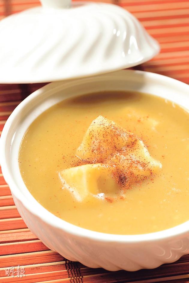 (5)加脫脂奶及年糕煮至滾起,倒入番薯粒,再煮兩至三分鐘,即成