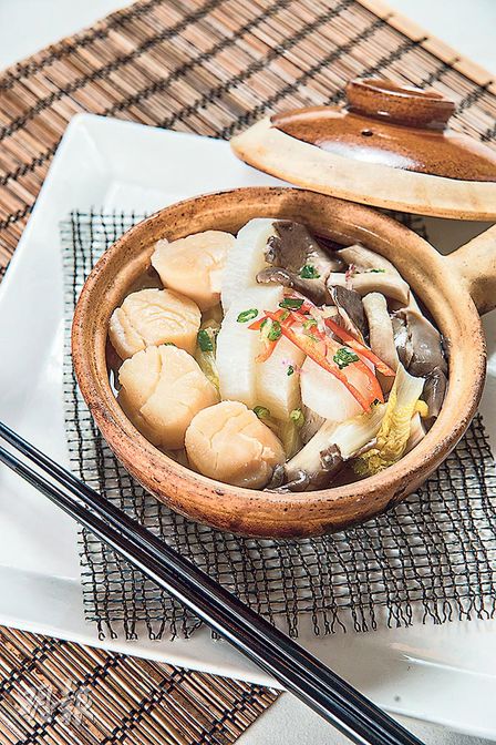 蘿蔔加娃娃菜、鮮菇及帶子炮製成雜菜煲,高纖低脂,兼能提供優質蛋白質,營養均衡。