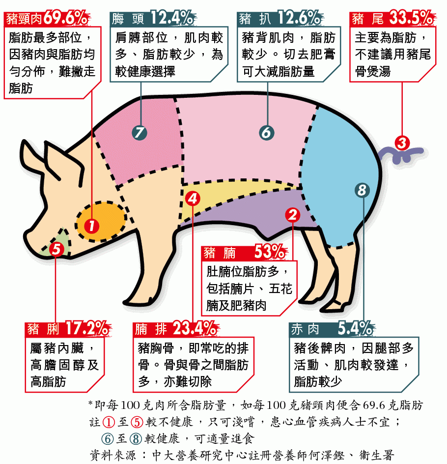 中文大學營養研究中心註冊營養師何澤鏗引用衞生署發佈的《解豬圖》,比較不同部位豬肉,脂肪最多依次為豬頸肉、豬腩、豬尾、腩排、豬脷、豬扒、脢頭及赤肉(見上圖)。