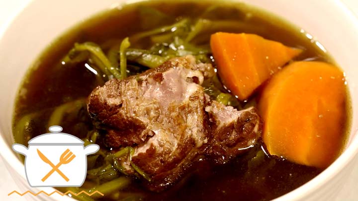 把所有材料洗淨。西洋菜以清水加鹽反覆浸泡數次,紅蘿蔔去皮切大塊。羅漢果切半備用。排骨汆水備用。鍋中加入約2.5公升水,放入全部材料,武火煮至水滾,改文火煮2小時,最後下鹽調味即可。