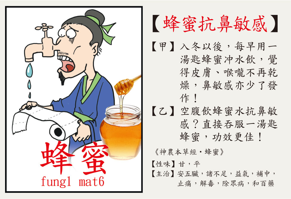 【明報專訊】蜂蜜冲水,有助紓緩鼻敏感,陳瑜明醫師更建議混入具補腎功效的黑豆粉飲用;同時推介一款溫補、益氣健脾的湯水,適合患者家常飲用,對抗鼻敏感。