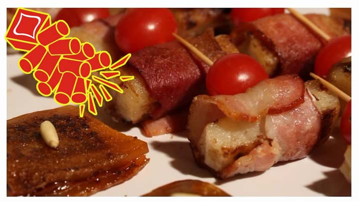 可先把蘿蔔糕切成條狀,慢火煎香,然後再用煙肉捲起後再煎,最後配上車厘茄一同上碟。外觀像「炮仗」的蘿蔔糕,不僅富喜慶洋洋之感,味道與煙肉亦非常匹配,加上車厘茄後令菜式增添清新消膩之效。