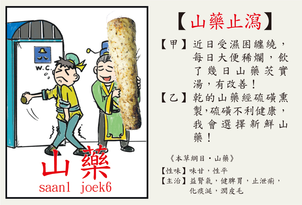 她補充:「脾虛引起的泄瀉,嚴重可在每餐後均出現腹瀉,形體愈來愈消瘦,這情况下,便不能單靠自行煲山藥湯處理,必須求醫服藥。針對此問題,中醫常用的一種藥方名為『參苓白朮散』,內含山藥、茯苓、白朮、甘草等藥材,以健脾、化濕、止瀉。中醫用藥一般選用來自河南的淮山,因世界各地約有六百多種山藥,當中因河南的土壤較適宜種植山藥,其藥用價值較高。」
