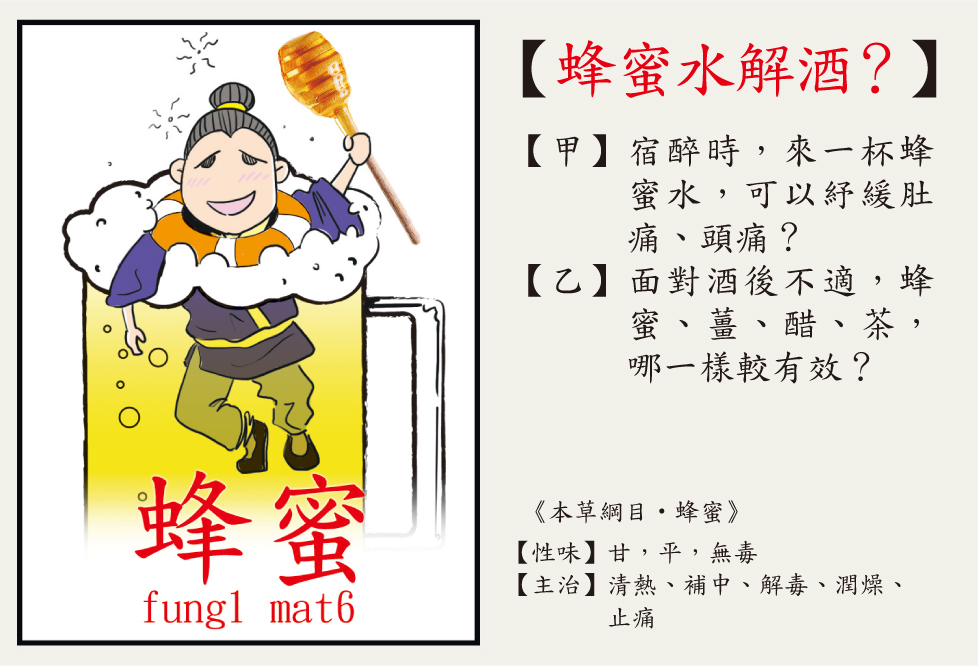 「蜂蜜水有用,主要針對酒醉翌日的宿醉不適,但無助解決當下的神志不清或嘔吐問題。」劉芷寧解釋,雖然中醫各種典籍,並未記及蜂蜜可解酒,但《本草綱目》等醫書卻記載蜂蜜可『補中、潤燥、止痛』,這剛好針對宿醉的各種不適,所以這偏方有一定道理。」所謂補中即是調理脾胃,有助紓緩宿醉時的肚脹不適。