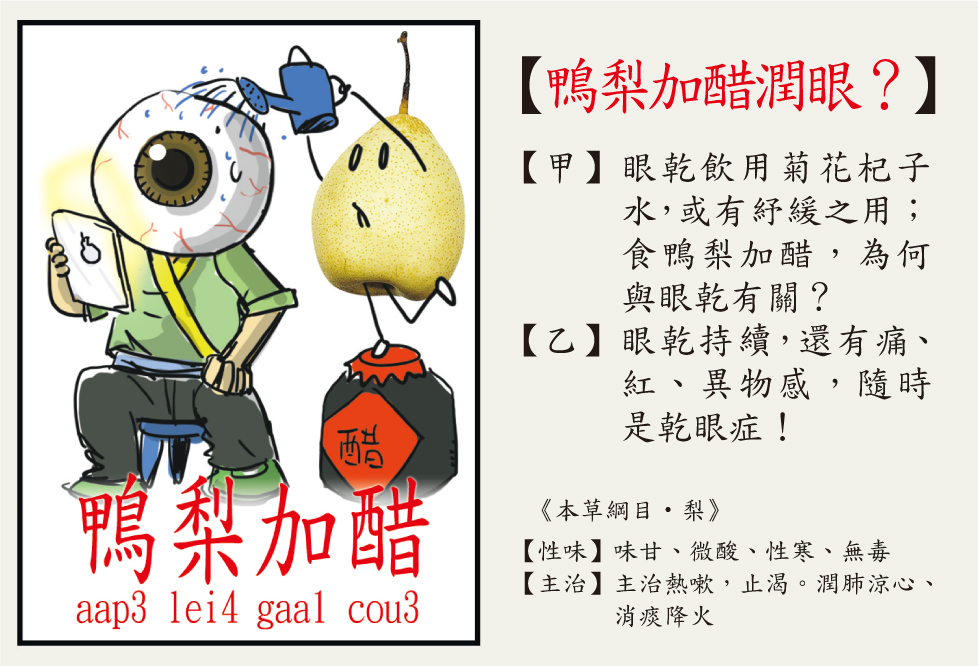 醋又如何?不是正好「入肝」嗎?「味酸的醋,的而且確入肝,但所謂『入肝』,其實更像是一個『開路』、『帶路』的工具,只是幫忙將其他藥物,更深入地帶進肝臟,發揮更大的藥效,所以,中醫有時會使用醋浸製過的藥物。相對而言,醋的護肝、補肝效果並沒那麼鮮明,不太有助於眼乾。想紓緩眼乾,其實有不少藥物、茶飲,遠勝於鴨梨醋,但必須對症下藥。」許懿清提醒。