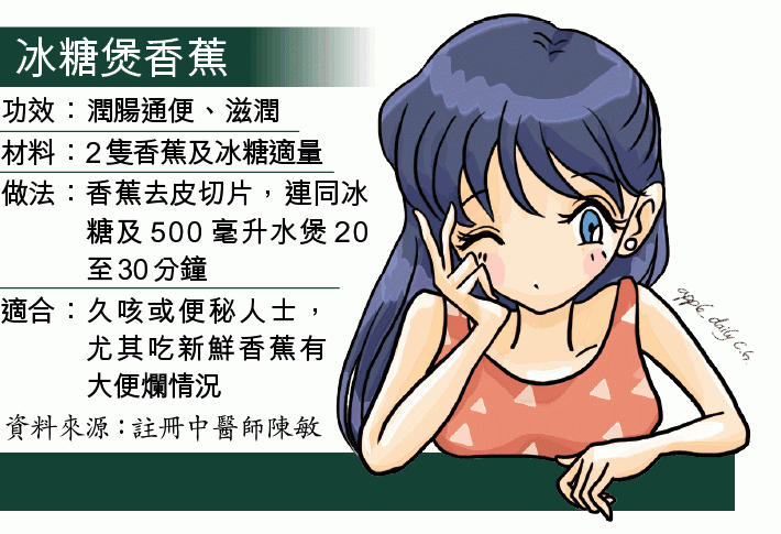 中醫角度蔬果一般偏寒涼,陳稱若怕食蕉會令脾胃受損,可進食其他「無咁寒涼」又能通便潤腸的蔬果,如橙、西莓等。秋葵含豐富纖維但也是寒涼食物,可用薑、 蒜等一起烹調,如炒秋葵,減低其寒性才進食。將香蕉烹調後才進食可減低其虛寒特性,尤其適合食蕉後會大便稀爛的人,推介炮製「冰糖煲香蕉」。另外不少長者 都排便困難,或與氣血不足有關,若擔心吃蕉會損脾胃可嘗試飲奶幫助潤腸,但礙於奶類偏濕,故不建議過量飲用。