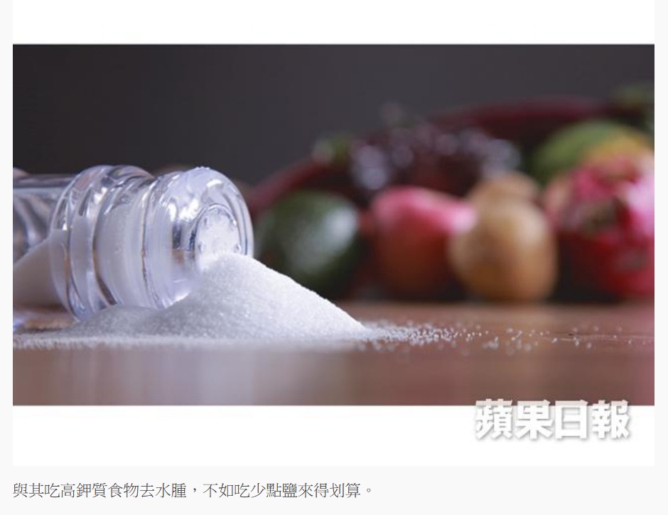 不過說到尾,謝詠瑩忠告大家,還是少鹽為妙。「多吃高鉀食物去排走多餘的鹽,倒不如一開始就吃少一點鹽來得好。」