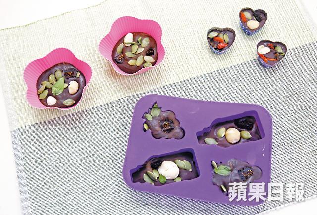 新年自製生機朱古力送禮,另一好處是可以按喜好及口味加入材料,陳推介可用夏威夷果仁、南瓜籽、無花果乾、杞子乾等,製作生機杞子朱古力。其中果仁含蛋白質,南瓜籽含豐富鎂和鋅,鎂有助減少肌肉繃緊,鋅對免疫系統、傷口癒合好重要。杞子則含維他命A,對眼睛健康有益,加入了無花果乾的生機朱古力更含纖維素。整體來說,生機朱古力的營養價值比傳統朱古力高,熱量及糖份也較低。生機朱古力沒有添加防腐劑,建議冷藏,保存期不多於一星期。