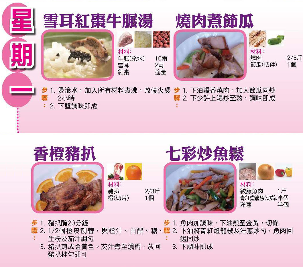 食物環境衛生署誠意向公眾推介''今日買乜餸'',好讓各位從此無需傷腦筋,輕輕鬆鬆煮好每一天!為照顧各人士的需要,食譜附有中文、英文、菲律賓文及印尼文供參閱。
