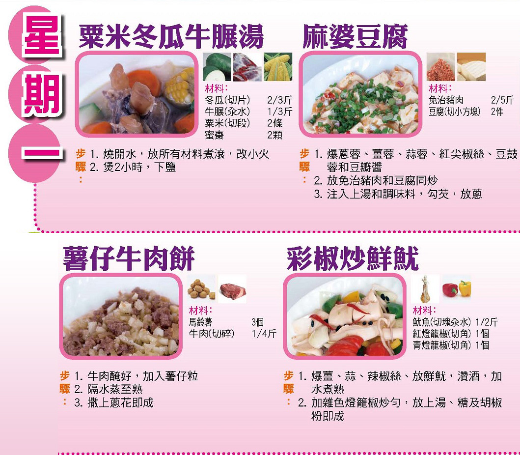 | 星期一 粟米冬瓜牛展湯 麻婆豆腐 薯仔牛肉餅 彩椒炒鮮魷 |