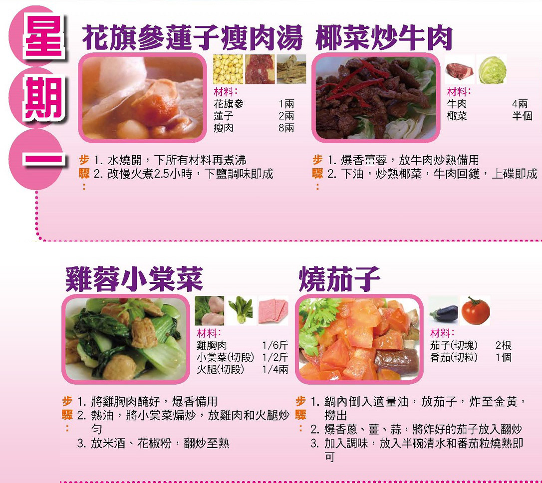 | 星期一 花旗參蓮子瘦肉湯 椰菜炒牛肉 雞蓉小棠菜 燒茄子 |