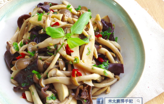 第3步:把杏鮑菇和黑木耳切絲,本菇和茶樹菇撕成一條條,加入汁料拌勻即可享用!