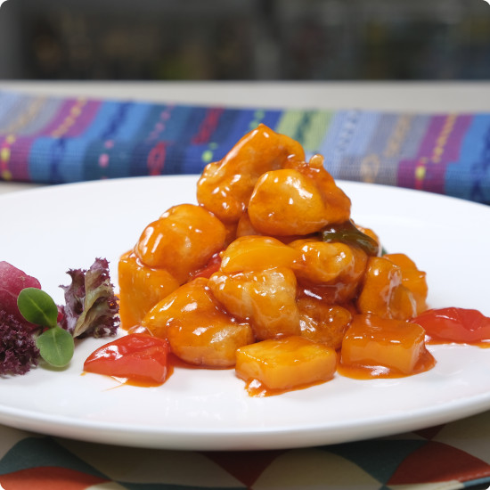 鑊中燒熱½湯匙菜油,以中火爆香三色椒及菠蘿,加入已拌勻的酸甜汁,可按喜好加入粟粉水調較醬汁濃稠度。