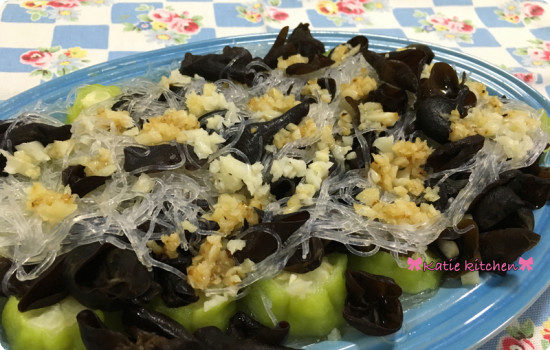 再鋪上雲耳, 粉絲, 以及炸蒜蓉, 蒜蓉, 加少許麻油及鹽, 大火蒸15-20分鐘即成, 若味道太淡, 可以加少許甜豉油