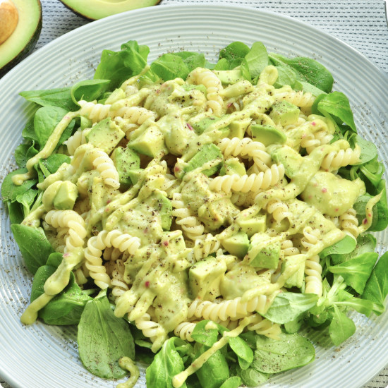 食時沙律菜先上碟,之後放上螺絲粉和牛油果粒,再淋上羅勒牛油果醬,灑上黑胡椒碎,即成
