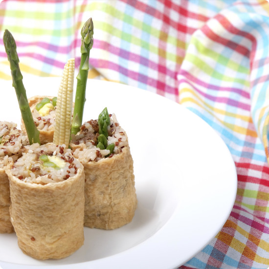 腐皮攤平,放上藜麥飯、牛肝菌粒、蘆筍、粟米仔,塗上蜜糖芥末醬,捲成條狀,切成小卷,再灑上芝麻即成。
