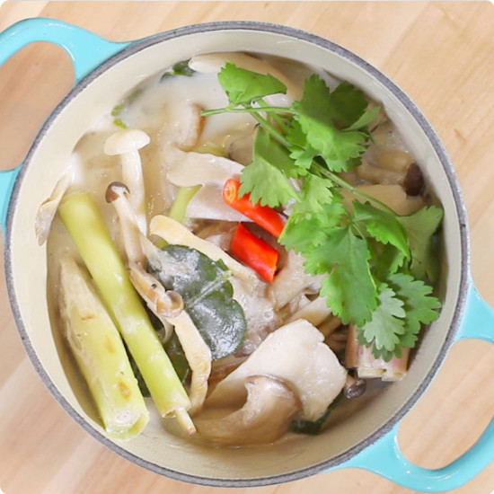 放進雜菇炒至乾身,倒入椰漿及水,加入青檸葉和辣椒仔,蓋上蓋煮大約7至8分鐘。