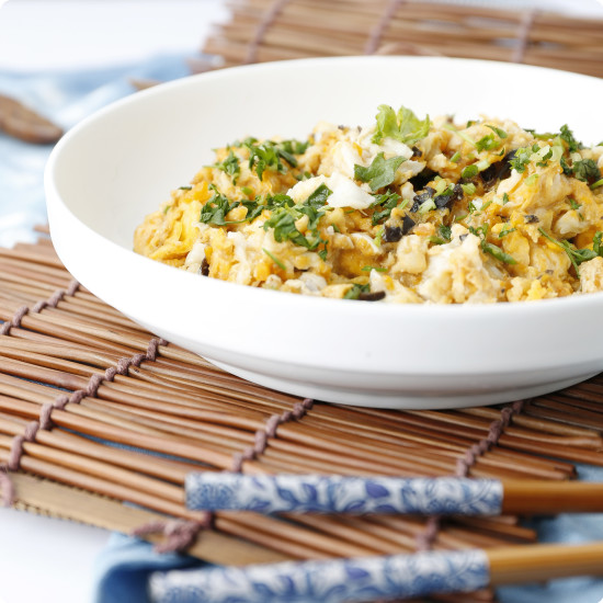 燒熱油,將蛋液倒入,用筷子快速前後同方向撥散。見蛋液半凝即加入其他材料及調味料,再轉用鑊鏟快兜幾下拌勻。然後上碟,略放芫茜點綴。