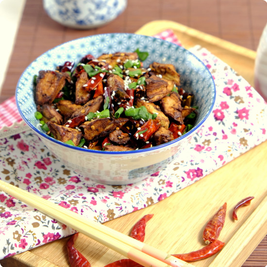 植物雞粒回鑊,轉大火快炒加入豆瓣醬和花雕酒。