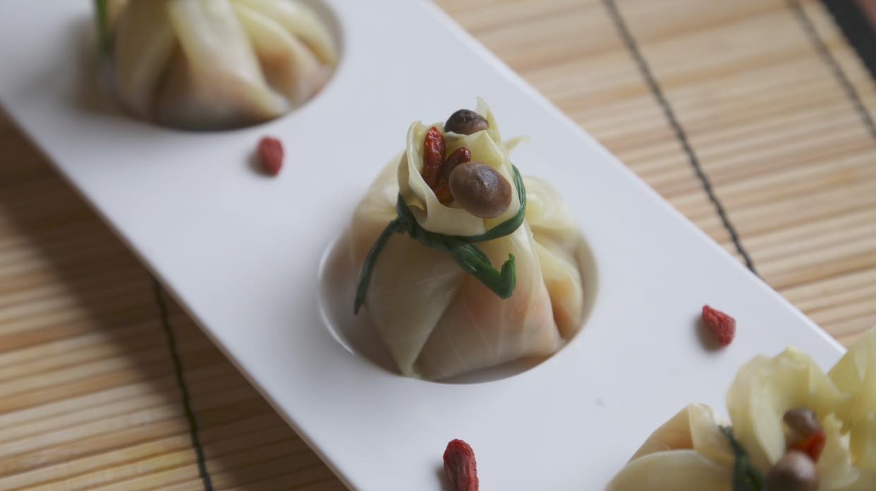 將2湯匙餡料放在一塊熟椰菜葉中央然後包成福袋做一條韮王包實, 杞子及日式草菇裝飾; 放入蒸籠蒸5 - 7分鐘至菜葉軑身; 上碟