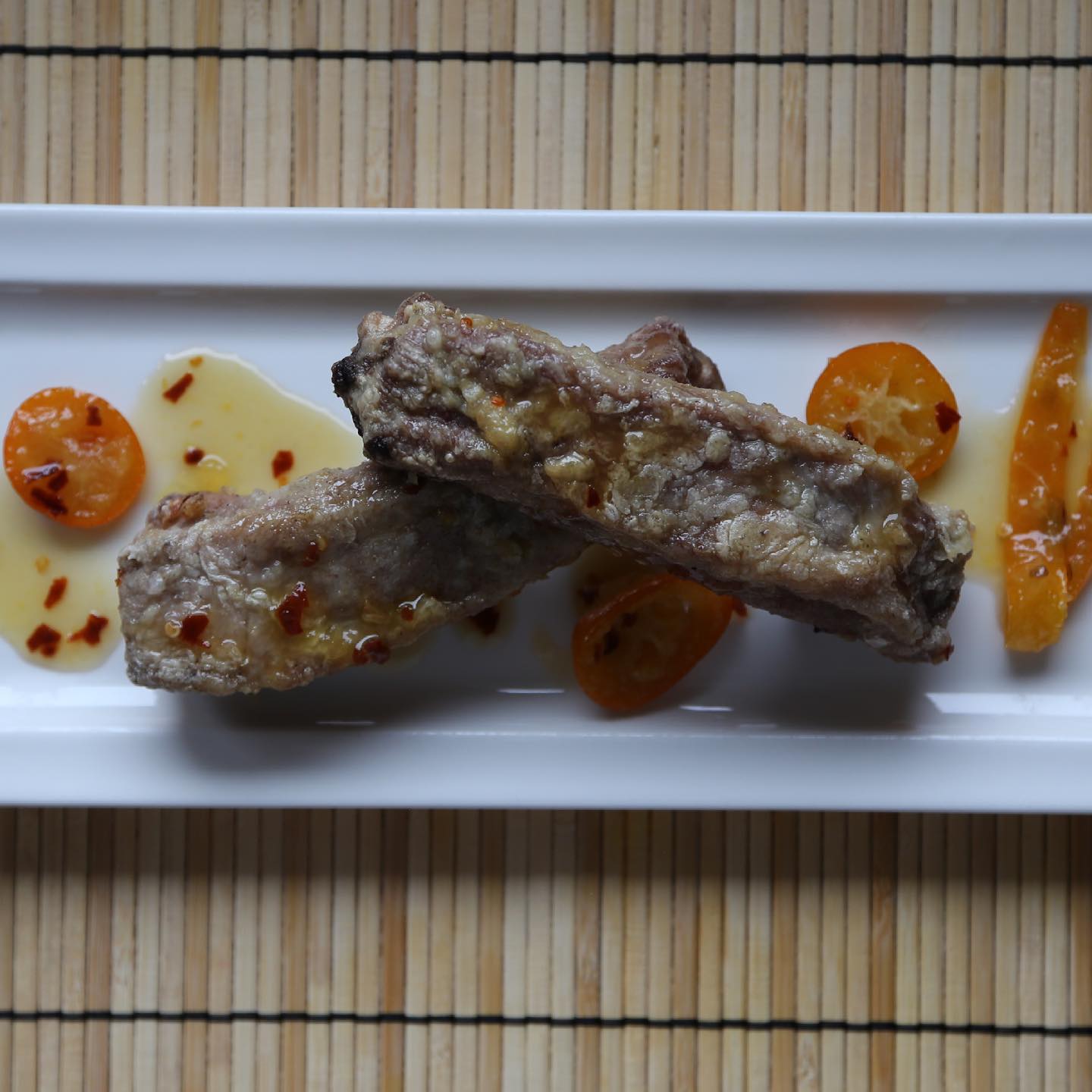醃好腩排拌入蛋汁,再沾上粟粉; 中火下在平底鑊放入油半煎炸腩排至金黃熟透,瀝乾。